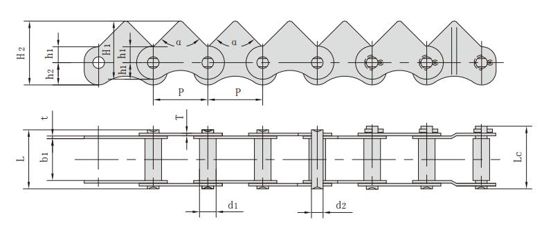 鏈號(hào) 節(jié)距 滾子直徑 內(nèi)節(jié)內(nèi)寬 銷軸直徑 銷軸長(zhǎng)度 齒形角 鏈板厚度 鏈板尺寸 抗拉強(qiáng)度 平均抗拉強(qiáng)度